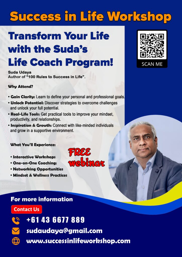 Founded by Suda Udaya, author of “100 Rules to Success in Life”, this transformative workshop is for anyone seeking personal or professional growth. Whether you aim to advance your career, build a business, or gain clarity in your life, this workshop provides the tools, strategies, and guidance you need to take meaningful steps toward success.